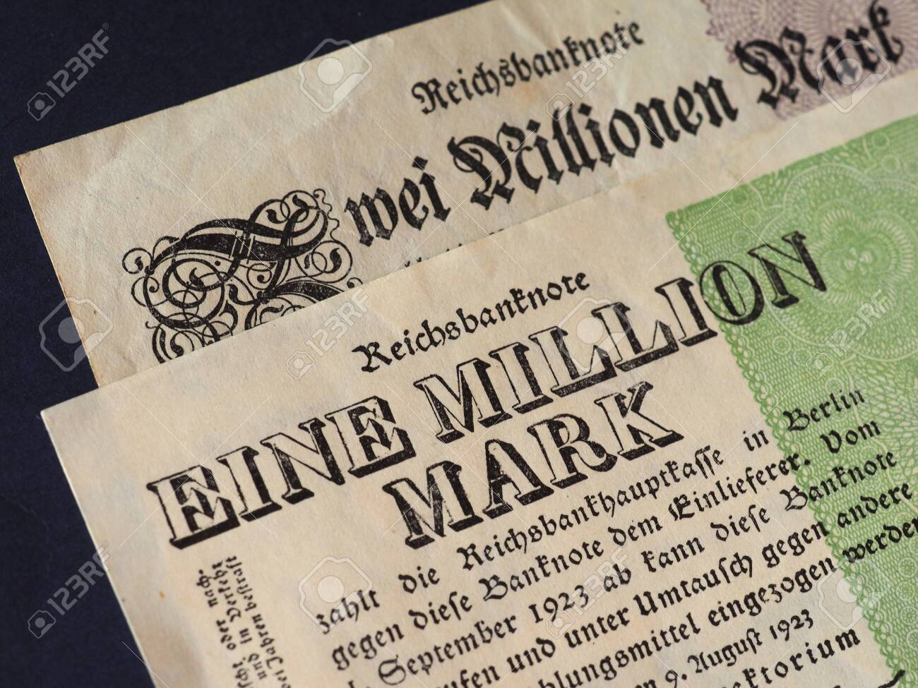 Eine Und Zwei Million Mark Meaning One And Two Million Mark Stock Photo Picture And Royalty Free Image Image 119170816 - Withdrawn in 1925, the 10 million germany mark banknote has two reichsbank seals printed on the front with german text.